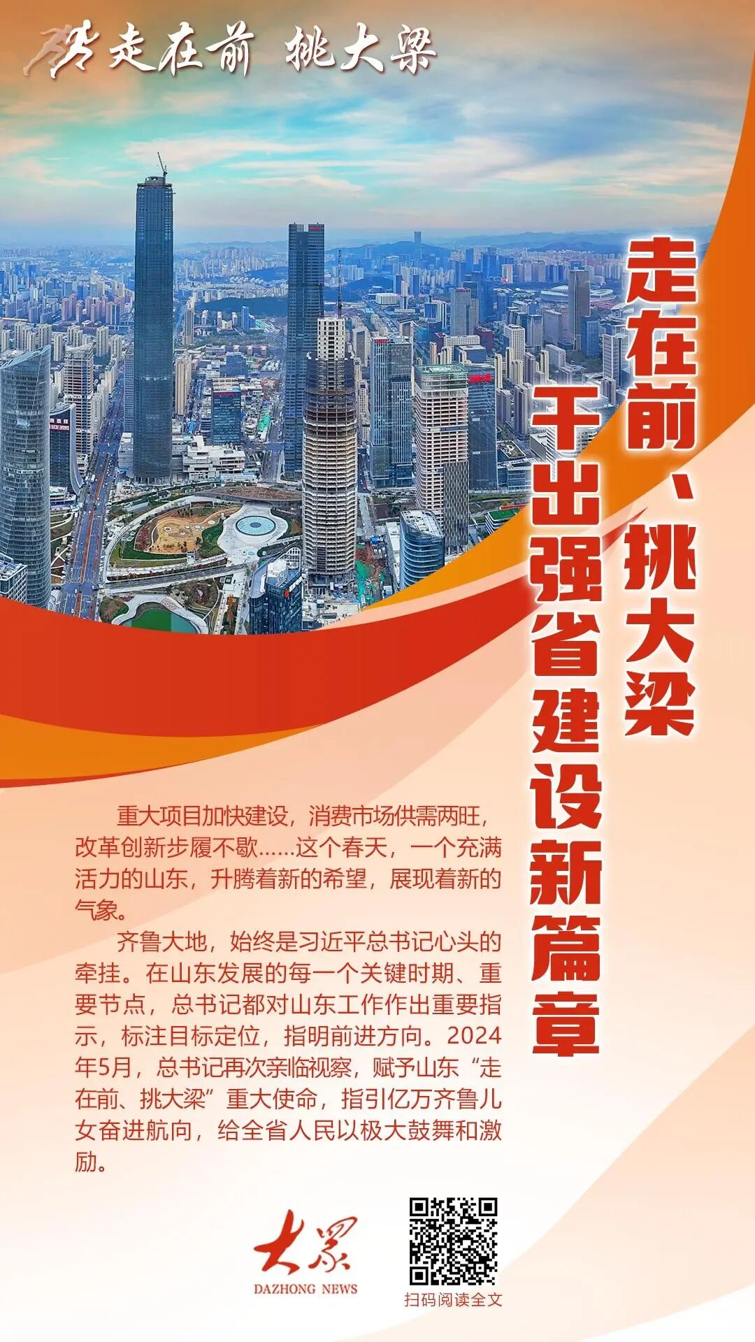 2024年是山东发展史上具有重大里程碑意义的一年,习近平总书记再次亲临山东视察,发表重要讲话、作出重要指示,对山东工作进一步明确总定位、新要求,赋予我们“走在前、挑大梁”重大使命,为山东发展提供科学指引和根本遵循。干出走在前的样子,干出挑大梁的担当。山东坚持以习近平新时代中国特色社会主义思想为指导,深入贯彻党的二十届三中全会精神,全面落实习近平总书记视察山东重要讲话精神,锚定“走在前、挑大梁”,稳扎稳打、踏踏实实做好各项工作,加快建设绿色低碳高质量发展先行区,打造高水平对外开放新高地,新时代社会主义现代化强省建设迈出坚实步伐。今年全国两会即将召开,大众日报·大众新闻客户端推出系列综述报道,全面展现山东贯彻落实党的二十届三中全会精神、推动总书记重要指示要求落实落地的生动实践,为奋力谱写中国式现代化山东篇章凝聚磅礴奋进力量。重大项目加快建设,消费市场供需两旺,改革创新步履不歇……这个春天,一个充满活力的山东,升腾着新的希望,展现着新的气象。齐鲁大地,始终是习近平总书记心头的牵挂。在山东发展的每一个关键时期、重要节点,总书记都对山东工作作出重要指示,标注目标定位,指明前进方向。2024年5月,总书记再次亲临视察,赋予山东“走在前、挑大梁”重大使命,指引亿万齐鲁儿女奋进航向,给全省人民以极大鼓舞和激励。牢记嘱托、感恩奋进,山东省委、省政府团结带领全省人民攻坚克难、砥砺前行,统筹推进稳增长、提质效、塑优势、强动力、防风险、惠民生,推动全省经济稳健向好、进中提质,新时代社会主义现代化强省建设取得新进展新成效。
